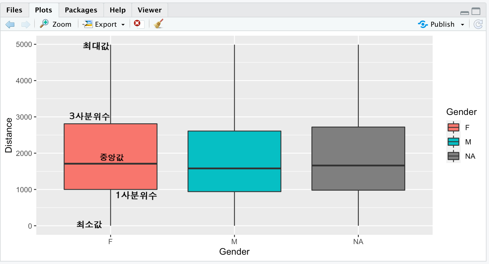 우측 그래프: ggplot(under_5000, aes(x=Gender, y=Distance)) + geom_boxplot(aes(fill=Gender))