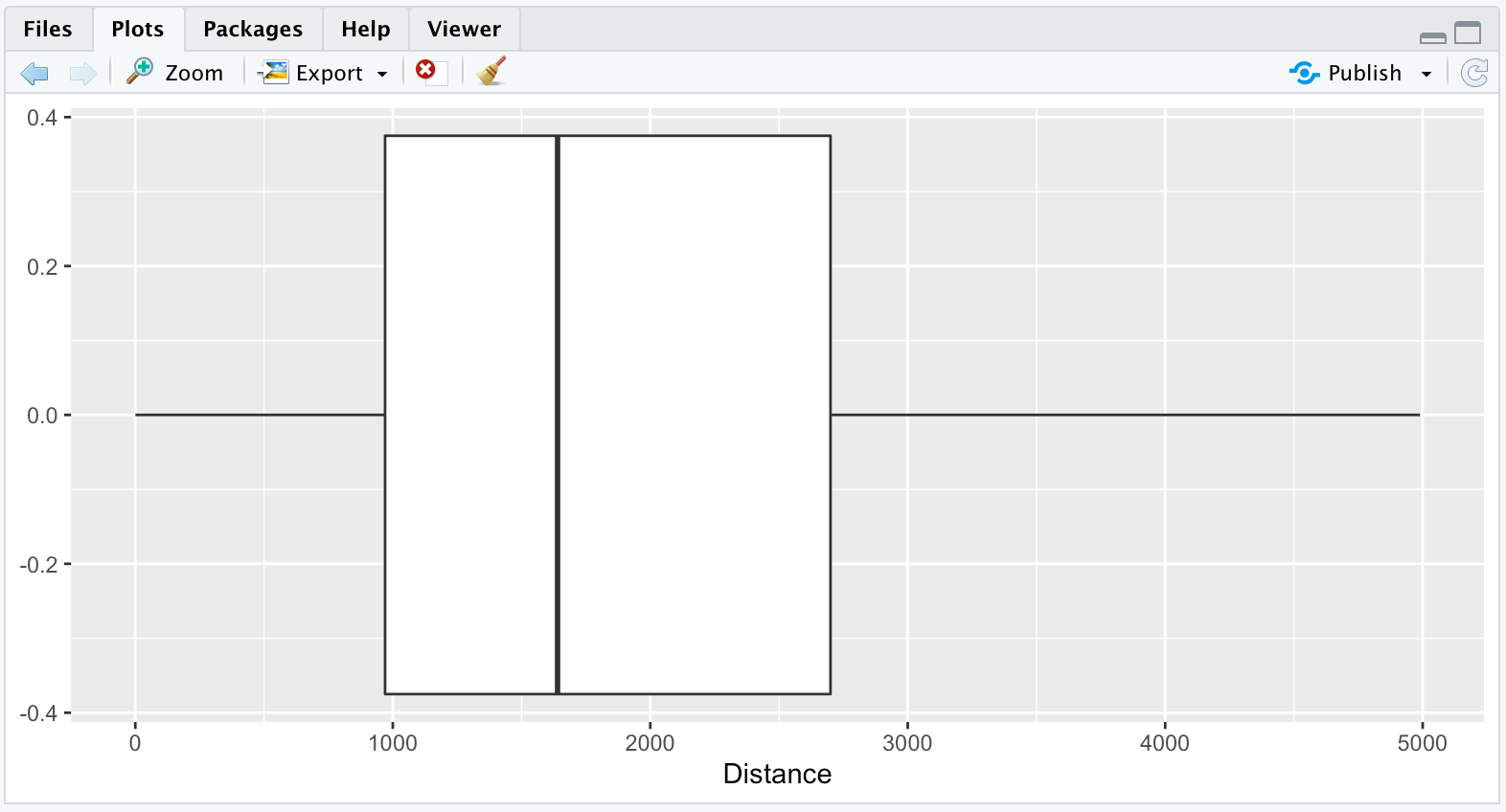 좌측 그래프: ggplot(under_5000, aes(x=Distance)) + geom_boxplot()