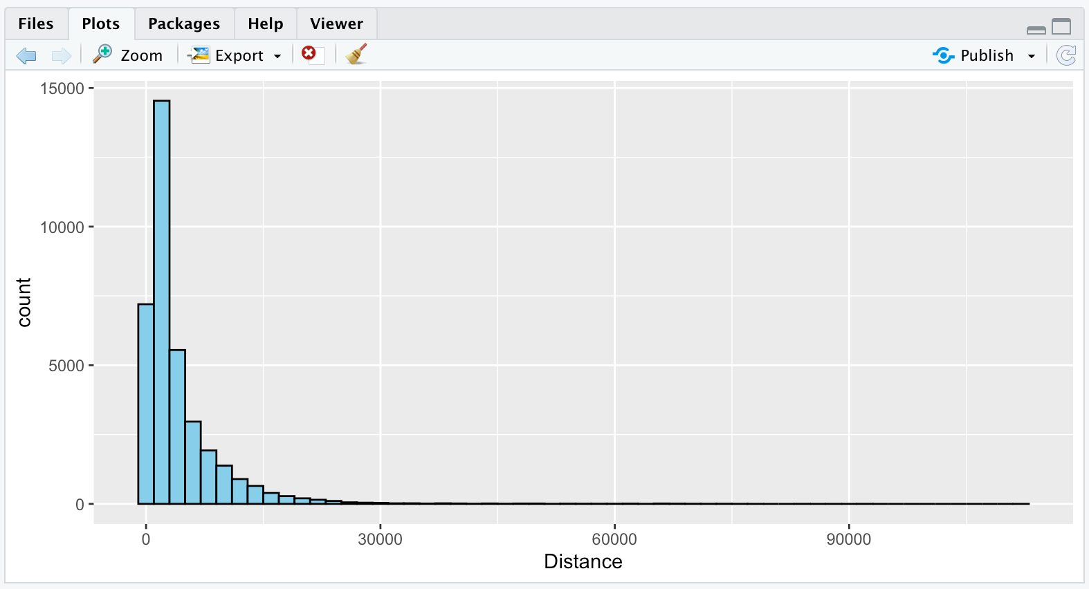 우측 그래프:ggplot(bike_data2, aes(x=Distance)) + geom_histogram(binwidth = 2000, fill='skyblue', color='black')