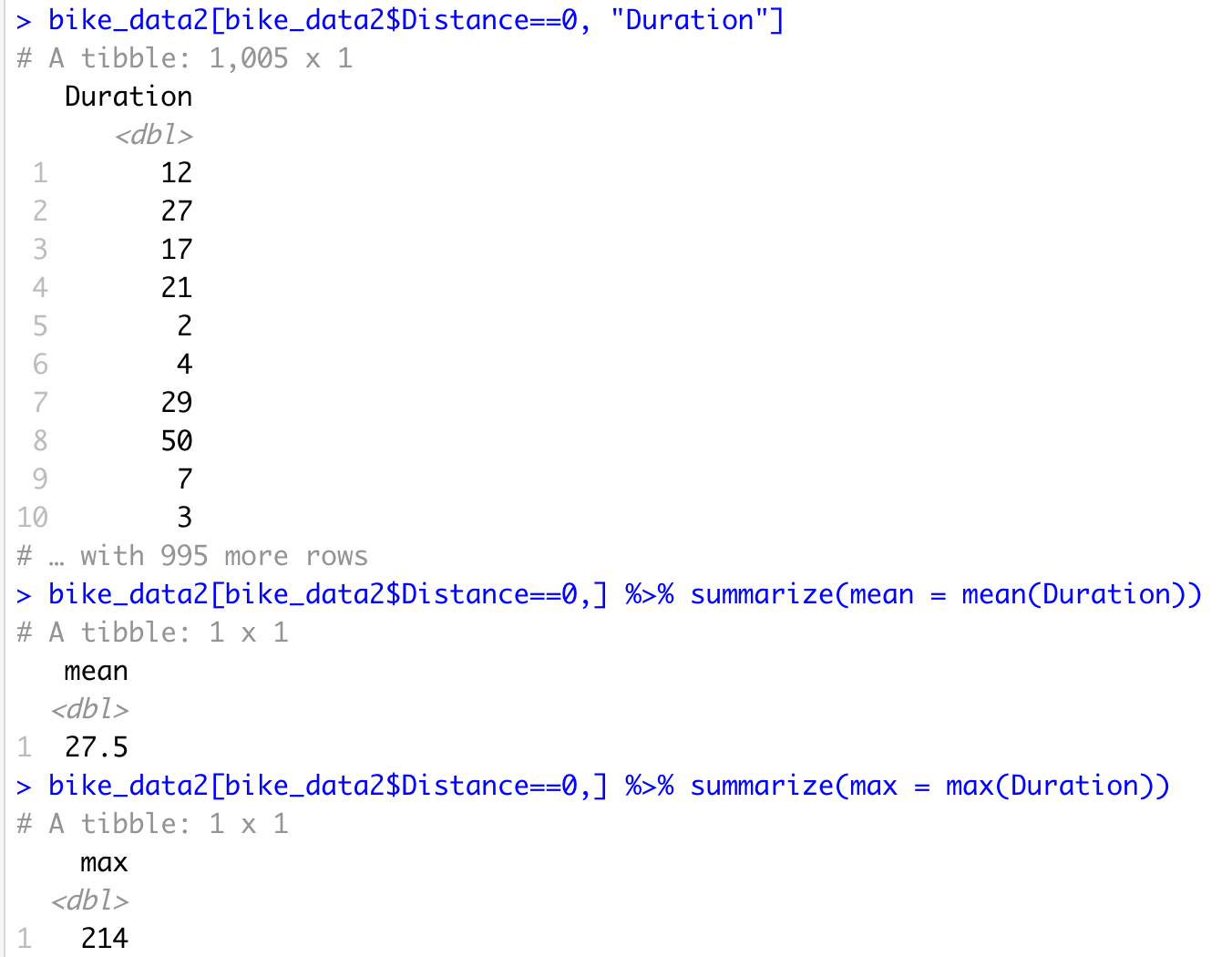 특정컬럼 Duration에 대한 평균값을 구하라는 명령 또한 괄호 속 값이 tibble이라 불가능하다.