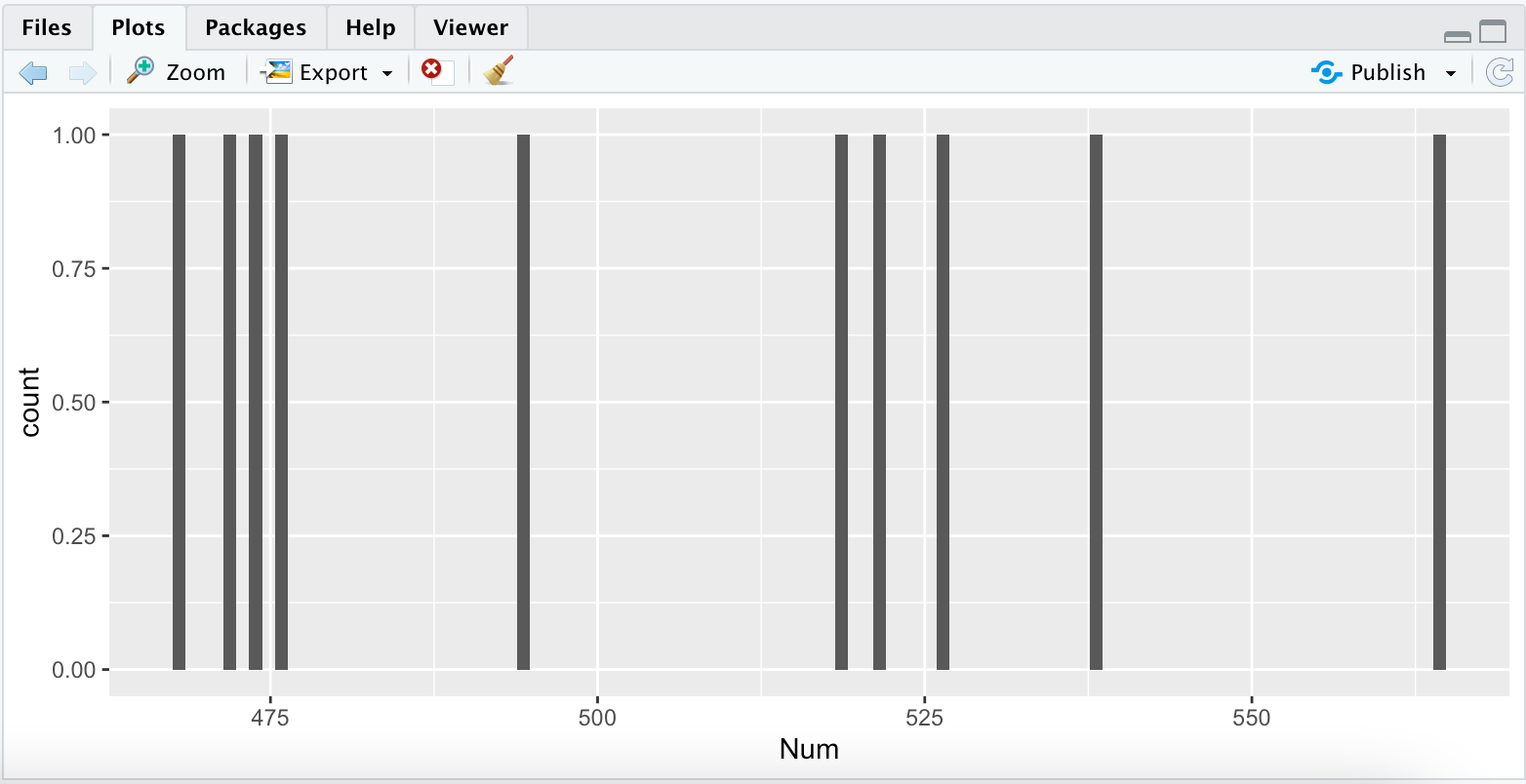 ggplot(random_sample, aes(x=Num)) + geom_histogram(bins=100)