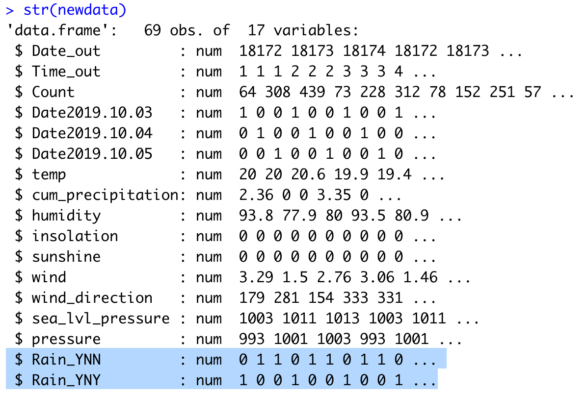 newdata <- data.frame(predict(dummy,newdata=bike_weather))