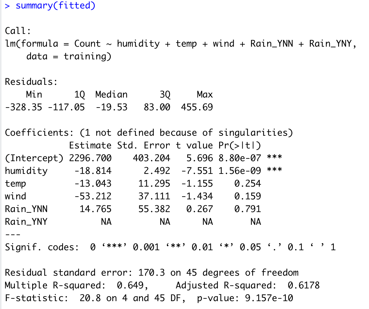 fitted <- lm(Count~humidity+temp+wind+Rain_YNN+Rain_YNY, data=training)