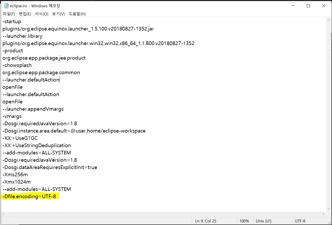 -Dfile.encoding=UTF-8 을 추가하면 굳이 일일이 안해도 UTF-8이 적용된다.