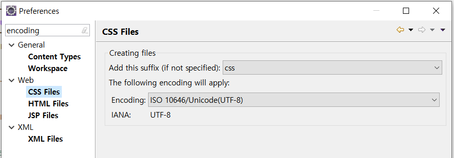 나는 txt, css, jsp, xml 을 기본으로 UTF-8로 하고 싶기 때문에 일일이 다 설정해준다.