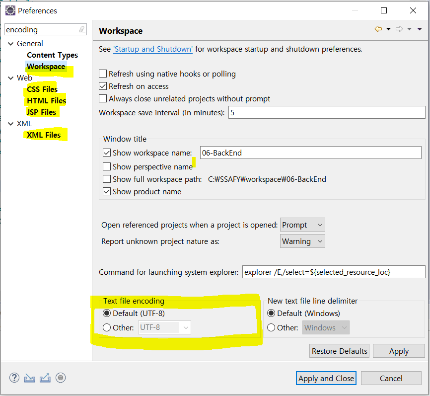 windows > preferences 선택 후, encoding 검색하게 되면